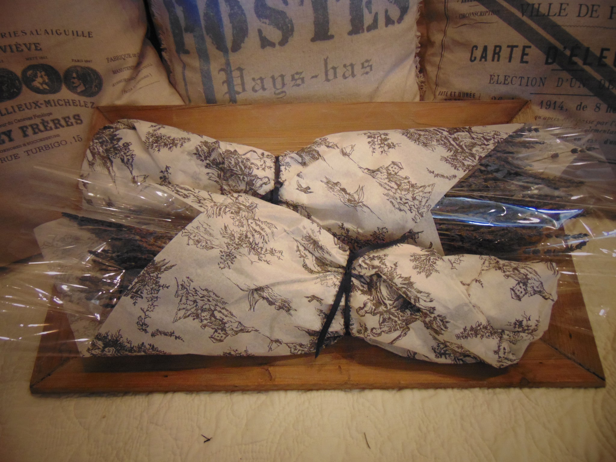 These lavender bunches are very fragrant and beautiful. Each bunch has several hundred stems and is wrapped up in black and white toile paper and tied with black satin ribbon.